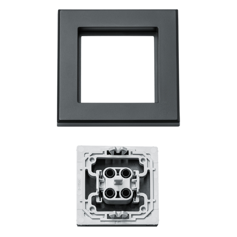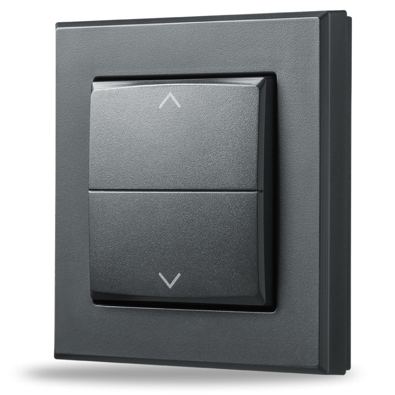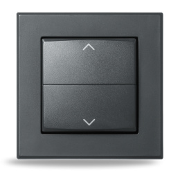 Kryt kolébkového vypínače se symboly šipek a rámečkem v antracitové barvě (HmIP-BRA-A) pro programovatelné bezdrátové akční členy (HmIP-BRC2, HmIP-BROLL, HmIP-BBL, HmIP-BSM, HmIP-BDT) o velikosti 55 mm je součástí systému chytré domácnosti Homematic IP.