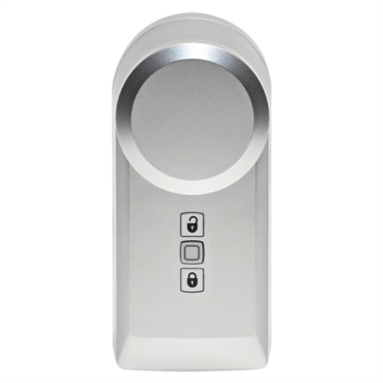 Bezdrátový inteligentní Pohon dveřního zámku ve stříbrné barvě (HmIP-DLD-S) určený k pohodlnému, motoricky poháněnému odemykání, zamykání a otevírání dveří je součástí systému chytré domácnosti Homematic IP.