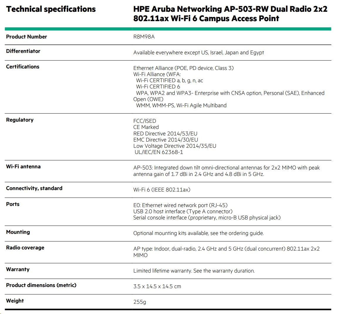 | Aruba Secure Infrastructure The Aruba 503 Series supports a Zero Trust/Secure Access Service Edge (SASE) architecture to better protect user authentication and wireless traffic. Select capabilities include: