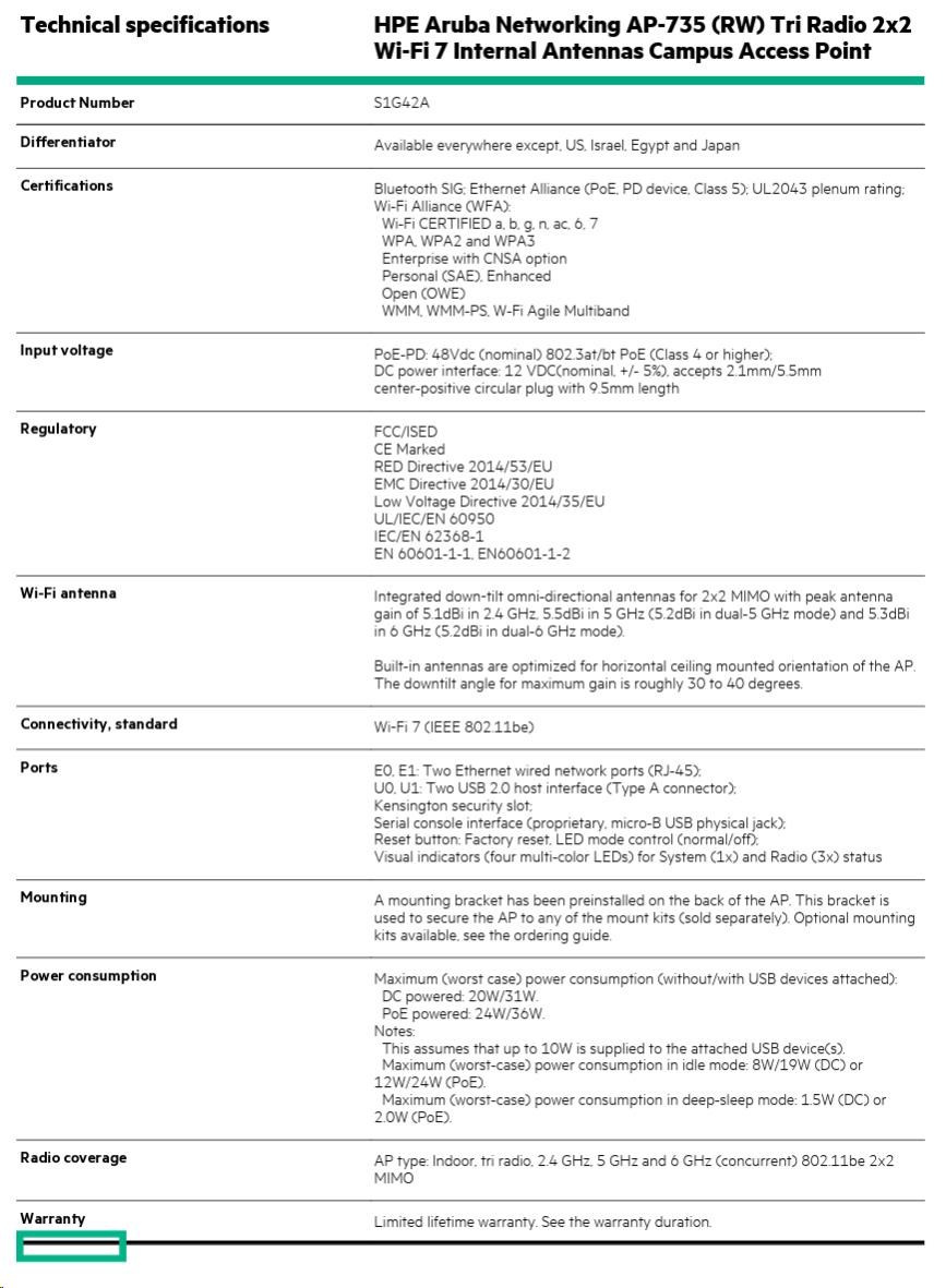 HPE Aruba Networking AP-735 (RW) Tri Radio 2x2 Wi-Fi 7 Internal Antennas Campus Access Point