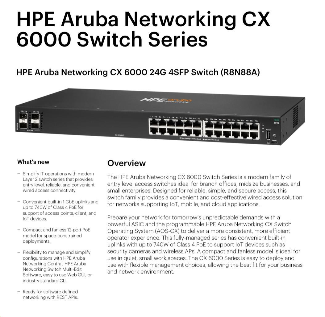 Popis HPE Aruba Networking CX 6000 24G 4SFP Switch R8N88A RENEW