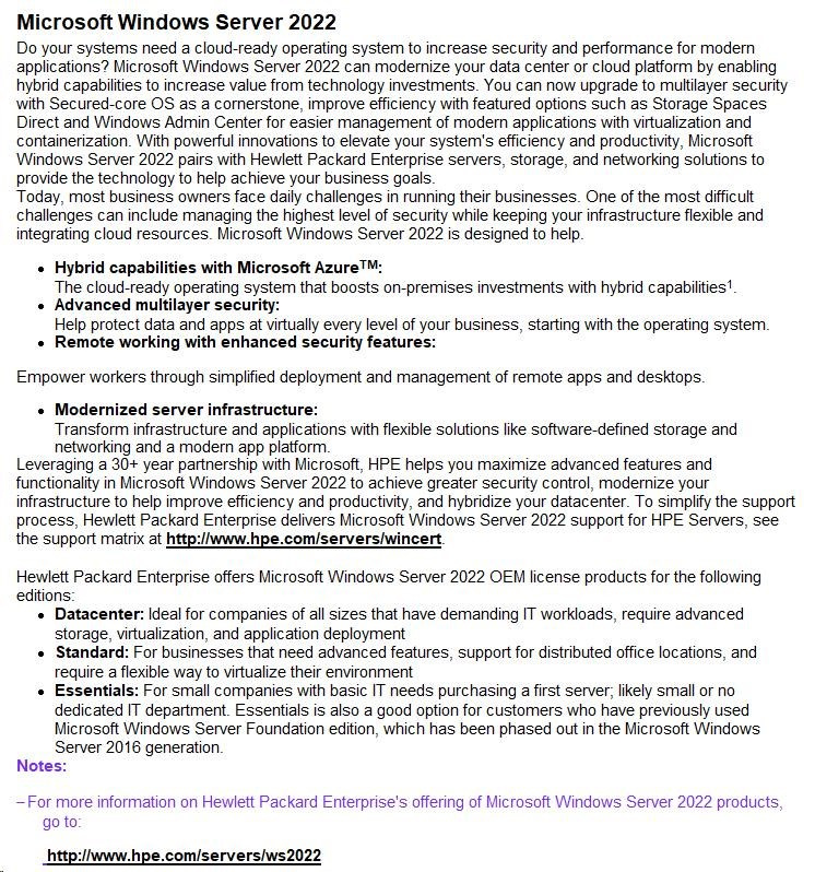 HPE Microsoft Windows Server 2022 Datacenter Edition ROK 16Core No Reassignment Rights CZ EN PL RU SV