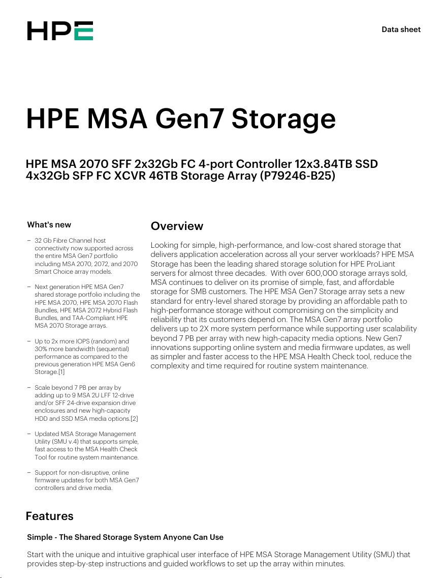 HPE MSA 2070 SFF 2x32Gb FC 4-port Controller 12x3.84TB SSD 4x32Gb SFP FC XCVR 46TB Storage Array Smart Choice