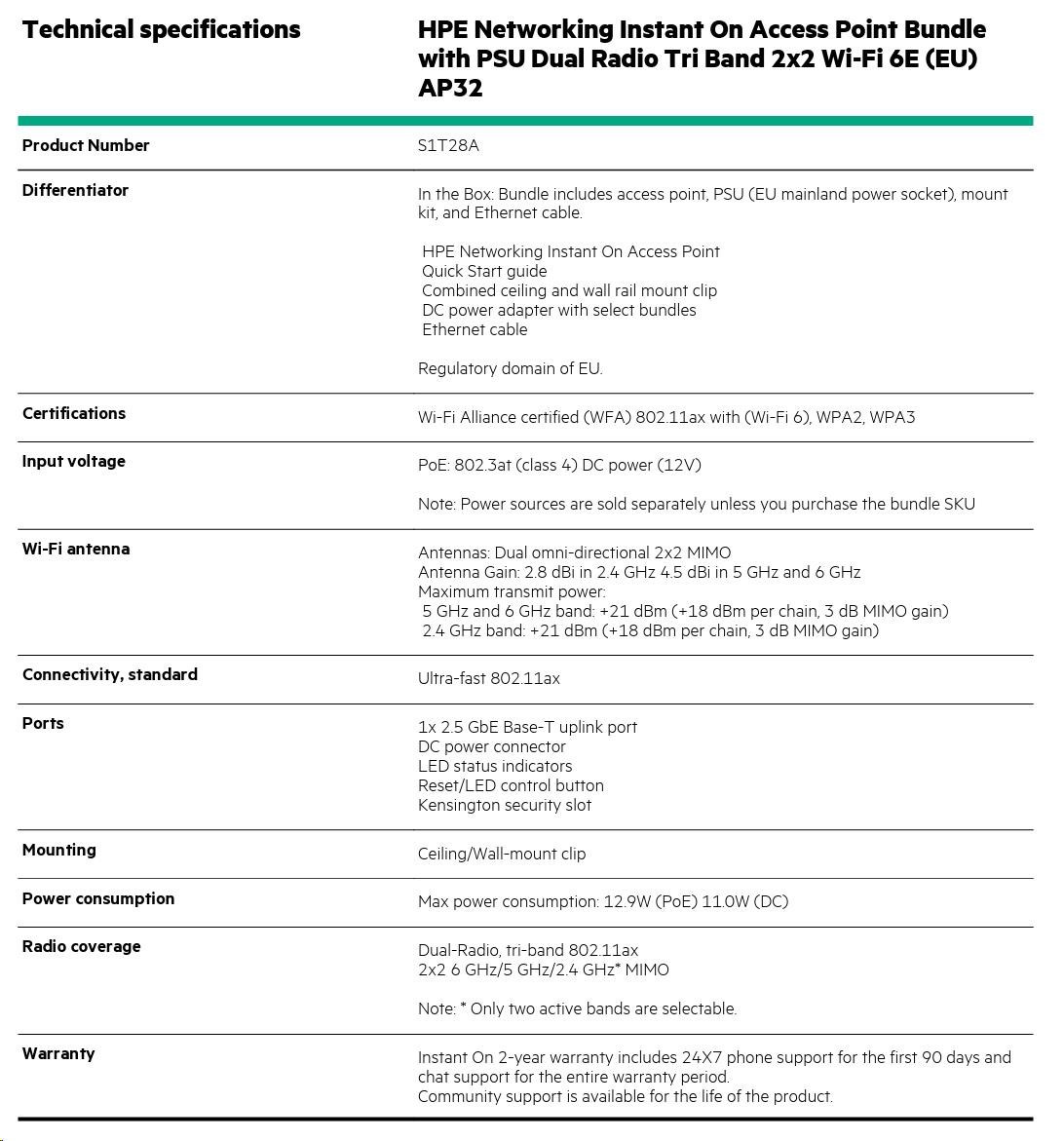 HPE Networking Instant On Access Point Bundle with PSU Dual Radio Tri Band 2x2 Wi-Fi 6E (EU) AP32