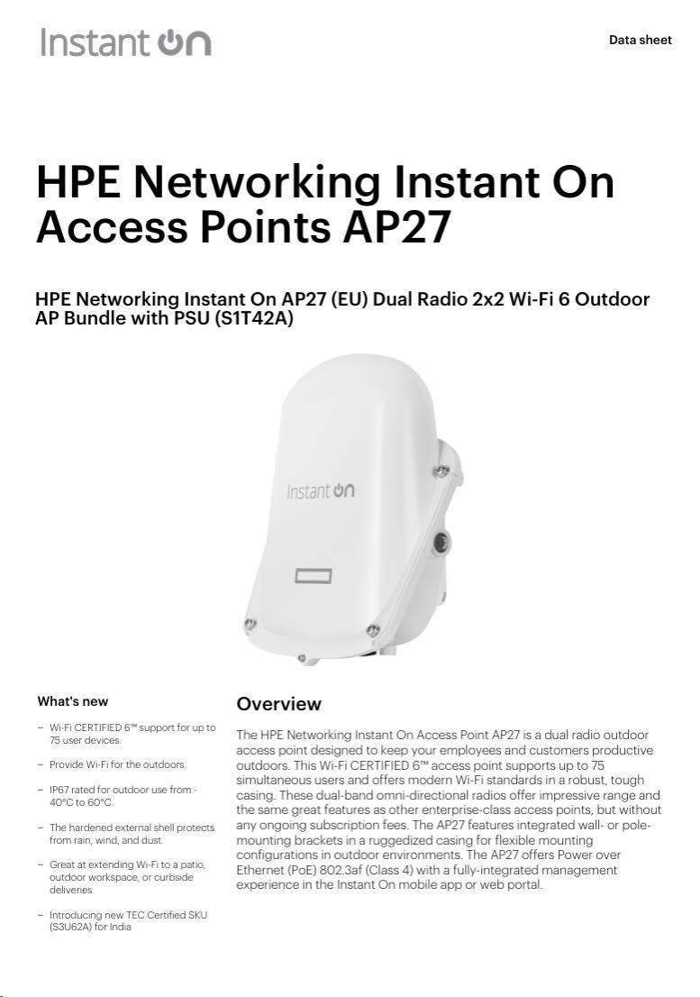 HPE Networking Instant On Access Point AP27 je dvoupásmový venkovní přístupový bod navržený tak, aby udržel vaše zaměstnance a zákazníky produktivní i venku. Tento přístupový bod s certifikací Wi-Fi CERTIFIED 6™ podporuje až 75 současně připojených uživatelů a nabízí moderní standardy Wi-Fi v robustním a odolném provedení. Tyto dvoupásmové všesměrové antény poskytují působivý dosah a stejné funkce jako jiné podnikové přístupové body, ale bez jakýchkoli průběžných poplatků za předplatné. AP27 je vybaven integrovanými držáky pro montáž na zeď nebo stožár v odolném krytu pro flexibilní instalace ve venkovních prostředích. AP27 nabízí napájení přes Ethernet (PoE) 802.3af (třída 4) s plně integrovanou správou prostřednictvím mobilní aplikace Instant On nebo webového portálu.