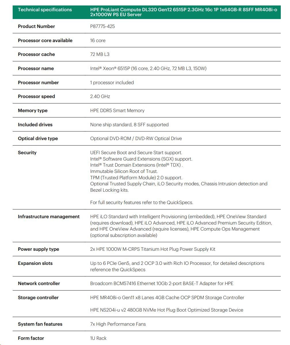 HPE PL DL320g12 6515P (2.4/16C) 1x64G (P69728) MR408i-o 8SFF NS204(2x480G) 2x1000W 10GbE NBD333 Smart Choice