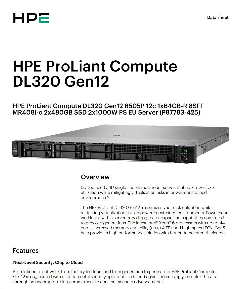 Provedení serveru:Rack, 1U Rack; Výrobce CPU:Intel; Maximální počet procesorů:1; Řada procesorů:Intel 12 Core Xeon; Model procesoru:Intel Xeon 6505P; Velikost paměti RAM (GB):128; Maximální paměťová kapacita serveru (GB):1024; Maximální počet slotů PCIe:2; Maximální počet HDD v serveru:8; Hot-plug cage pro HDD:2.5" SFF; RAID:1, 5; Redundantní zdroj.Více