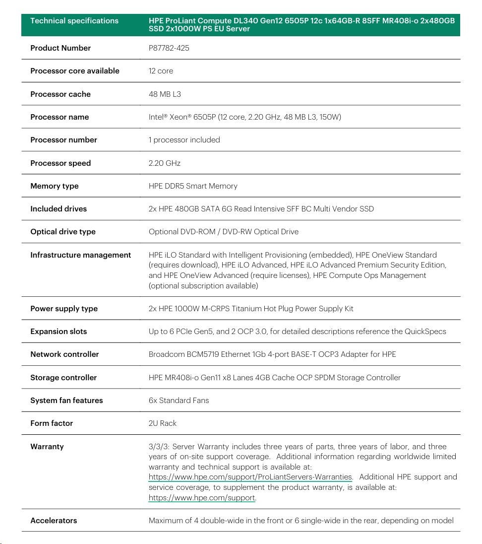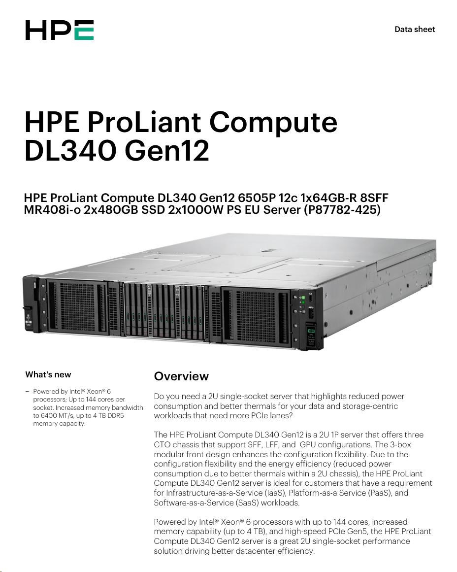 HPE PL DL340g12 6505P (2.2/12C) 1x64G (P69728) 2x480G MR408i-o 8SFF 2x1000W 1GbE NBD333 Smart Choice