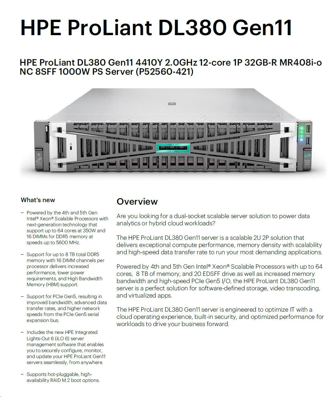 Popis HPE PL DL380g11 4410Y (2.0/12C) 32G MR408i 8SFF 1000W 4x1Gb 2U RENEW P52560-421