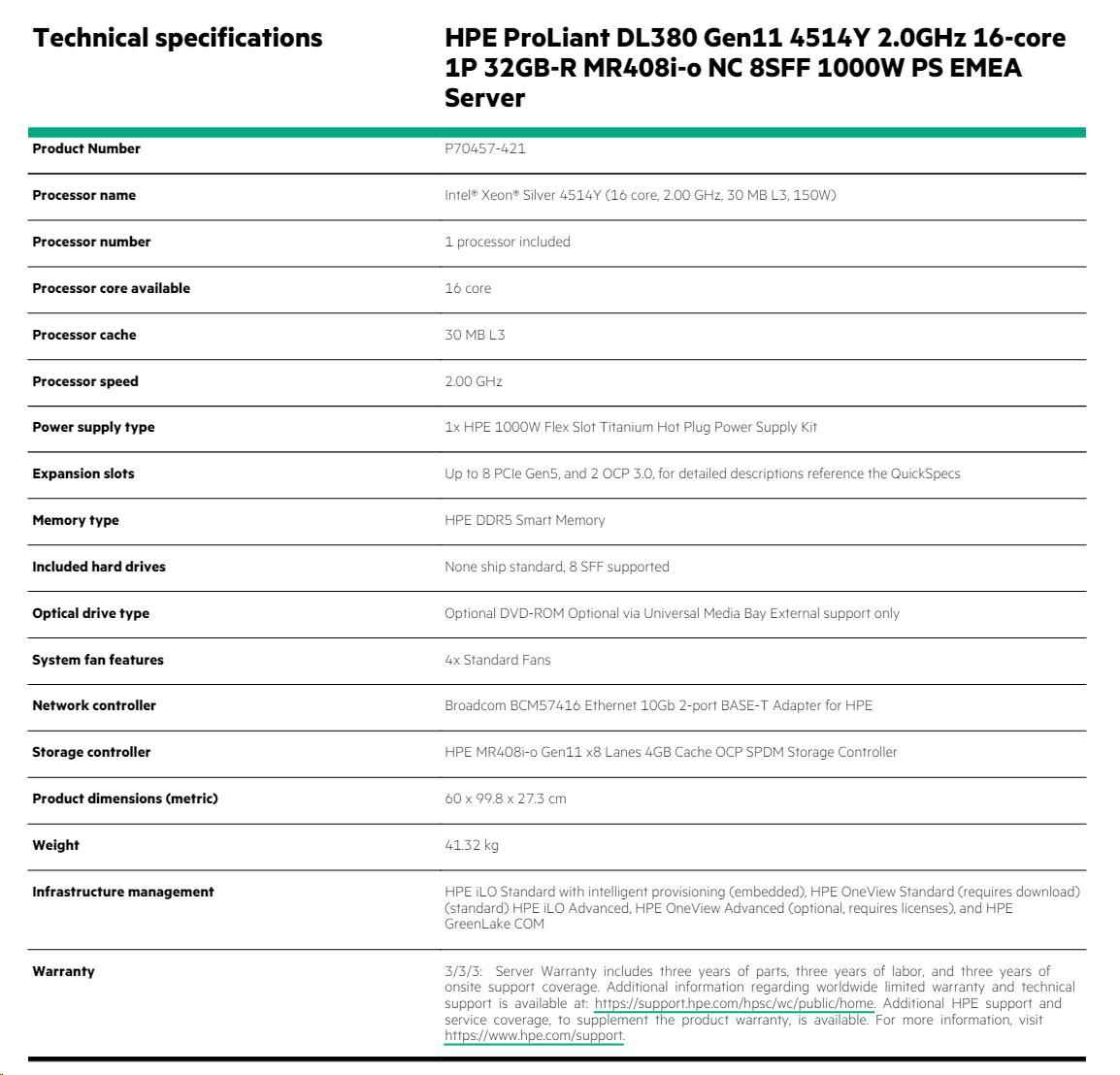 | Chassis | HPE ProLiant DL380 Gen11 8SFF NC Configure-to-order Server | |