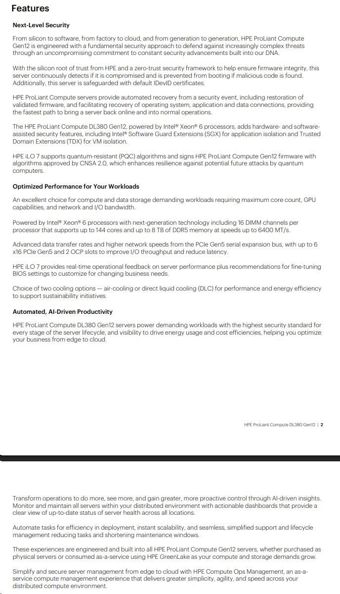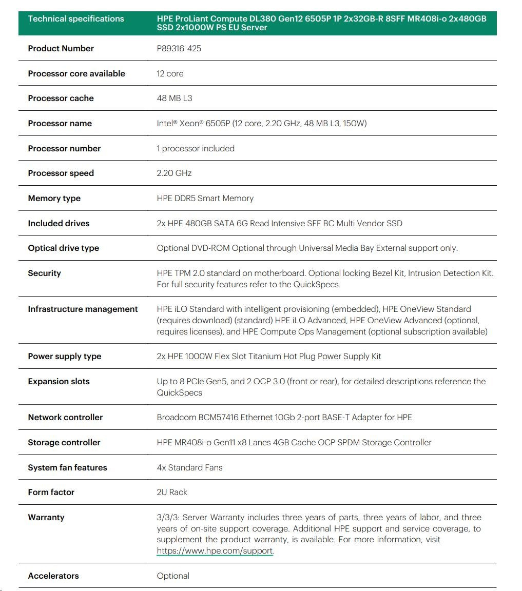 Provedení serveru:Rack, 2U Rack; Výrobce CPU:Intel; Maximální počet procesorů:2; Řada procesorů:Intel 12 Core Xeon; Model procesoru:Intel Xeon 6505P; Velikost paměti RAM (GB):64; Maximální paměťová kapacita serveru (GB):256; Maximální počet slotů PCIe:2; HDD Kapacita (GB):8000; Maximální počet HDD v serveru:8; Hot-plug cage pro HDD:3.5" LFF; RAID:1, 5.Více