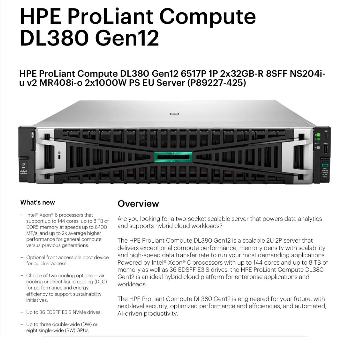 Provedení serveru:Rack, 2U Rack; Výrobce CPU:Intel; Maximální počet procesorů:2; Řada procesorů:Intel 16 Core Xeon; Model procesoru:Intel Xeon 6517P; Velikost paměti RAM (GB):64; Maximální paměťová kapacita serveru (GB):256; Maximální počet slotů PCIe:2; Maximální počet HDD v serveru:8; Hot-plug cage pro HDD:2.5" SFF; RAID:1, 5; Redundantní zdroj.Více
