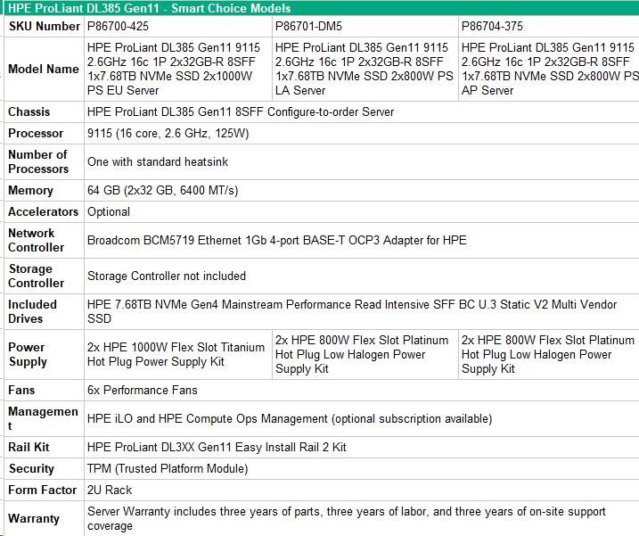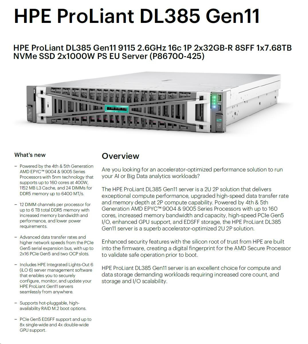 HPE PL DL385g11 AMD EPYC 9115 (2.6/16C) 2x32G (P64985) 1x7.68TB NVMe 2x1000W 8SFF 2p10GT Smart Choice