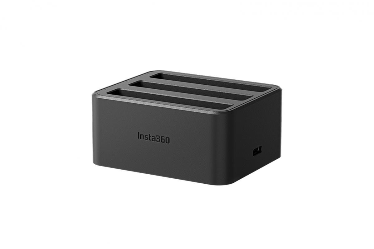 Nabíjecí hub pro tři baterie pro kameru Insta360 X4. Hub nabije 2290 mAh akumulátor za 43 minut (za 26 minut na 80%)..