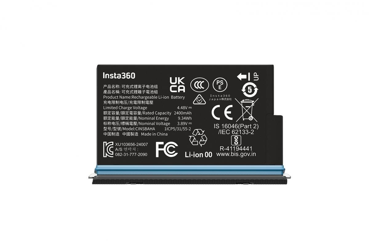 Kapacita: 2400 mAh Napětí: 3,85 V Jmenovitý výkon: 9,34 Wh Výdrž: až 185 minut při 5K/24 fps Kompatibilita: pouze s modelem Insta360 X5 Typ baterie: Li-ion.