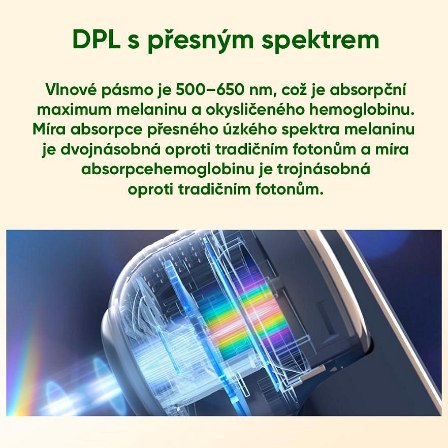 Tento inovativní přístroj je vaší osobní zbraní proti nejčastějším nedokonalostem pleti. Využívá vysoce přesné úzkospektrální světlo (500–650nm), které cíleně působí na melanin (pigmentové skvrny) a hemoglobin (začervenání). Na rozdíl od běžných IPL přístrojů technologie DPL odfiltruje neužitečné světelné spektrum a koncentruje energii přesně tam, kde je potřeba. Díky tomu je ošetření nejen mnohem účinnější, ale také bezbolestné a šetrné k vaší pokožce.