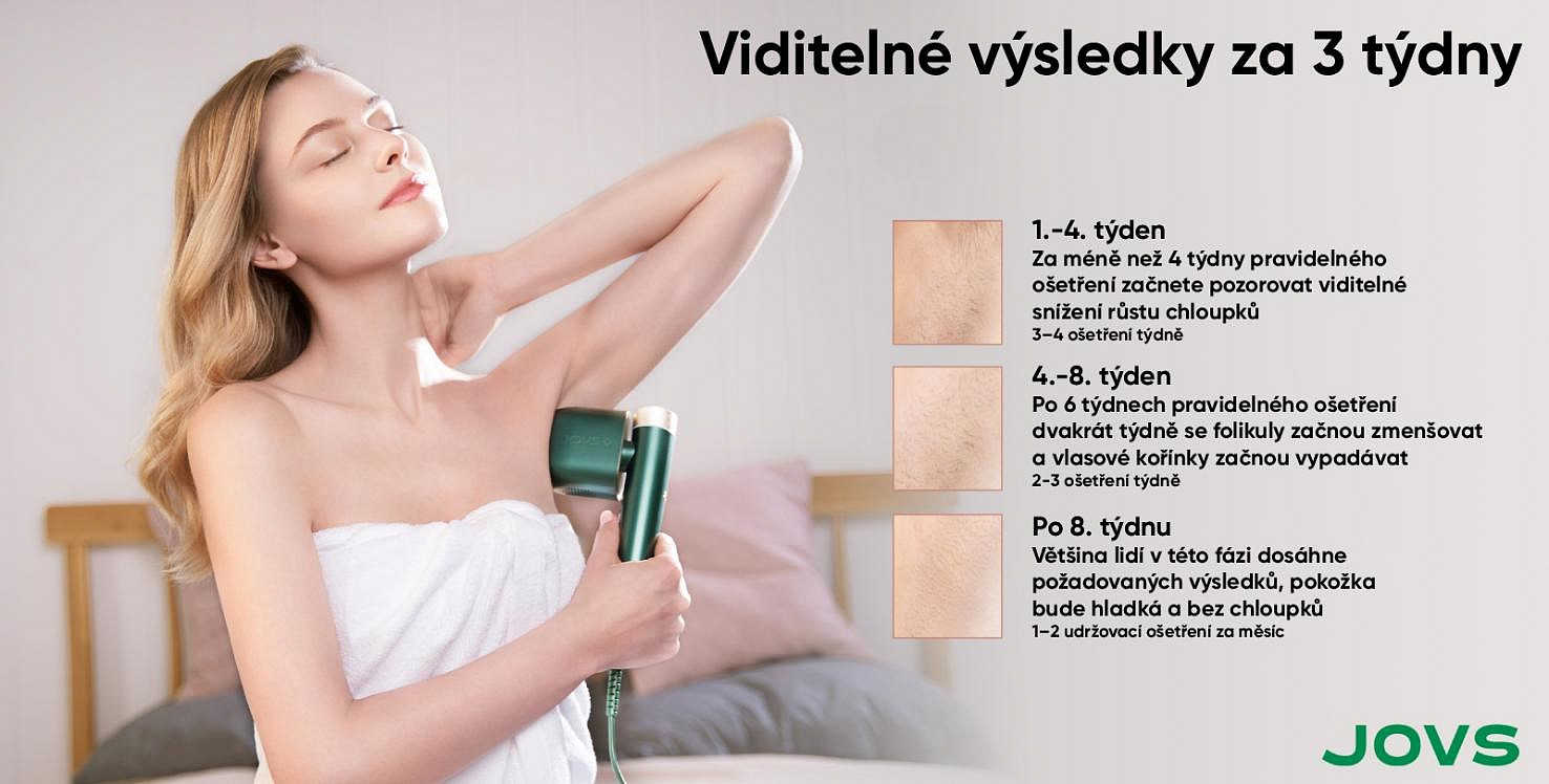 *Toto zařízení může používat kdokoli s typem pleti I až V na Fitzpatrickově stupnici. Pokud máte velmi tmavý odstín pleti (typ VI), toto zařízení prosím nepoužívejte. JOVS Pro II lze použít k ošetření tmavých blond až černých typů chloupků, ale nelze jej použít k ošetření světlých blond, zrzavých nebo šedivých chloupků.