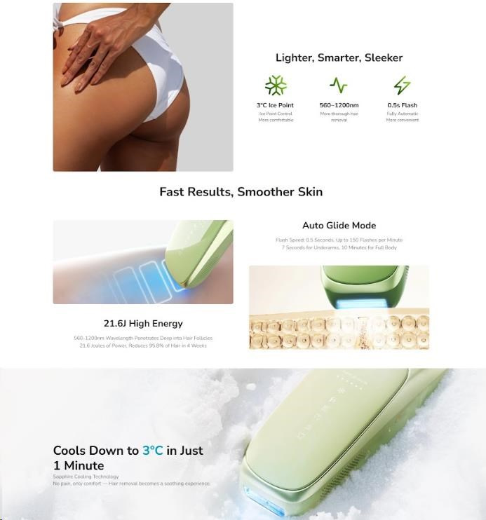 Představte si, že již za 4 týdny uvidíte viditelnou redukci chloupků a vaše pokožka bude hedvábně hladká. Unikátní chladicí technologie, která udržuje teplotu hlavice na příjemných 10 °C, zajišťuje naprosto bezbolestné ošetření od začátku do konce. To vše je zabaleno v unikátním, kompaktním a lehkém designu (pouhých 286 g), který je inspirován elegancí starověkých svitků a je dokonalým společníkem na cesty.
