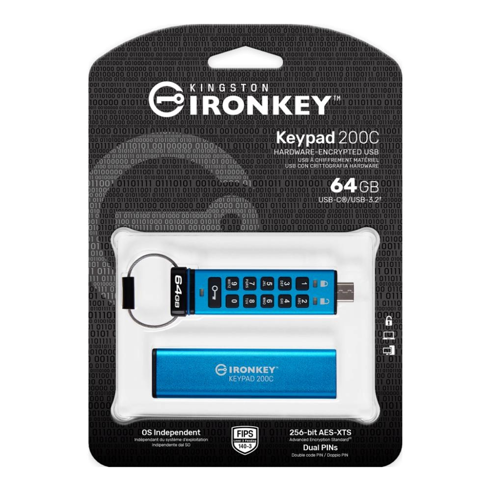 Řada Kingston IronKey Keypad 200 se skládá z hardwarově šifrovaných disků USB typu A a USB typu C nezávislých na operačním systému s alfanumerickou klávesnicí pro snadný přístup pomocí kódu PIN. KP200 obsahuje 256bitové hardwarové šifrování XTS-AES. Je také certifikován podle standardu FIPS 140-3 Level 3 (pending) pro zabezpečení vojenské úrovně s vylepšeními, která dále zvyšují laťku ochrany dat. Jeho obvody jsou pokryty vrstvou speciálního epoxidu, který prakticky znemožňuje vyjmutí součástek bez jejich poškození; tento odolný epoxid brání útokům na polovodičové součástky.