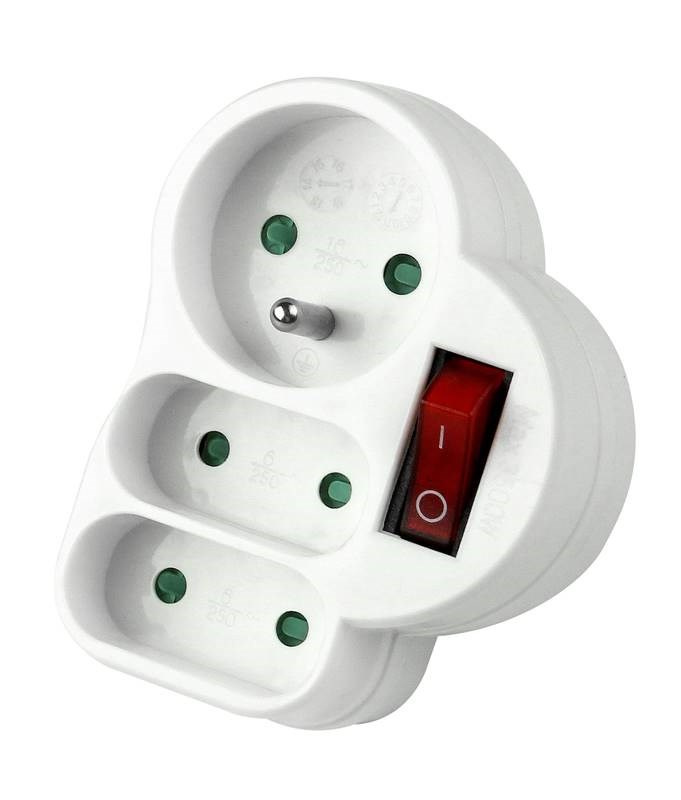1 x kulatá + 2 x plochá zásuvka s vypínačem 250 V~/ 2x6A 1x10A. Max 3500W. Dětská ochrana-clonky.
