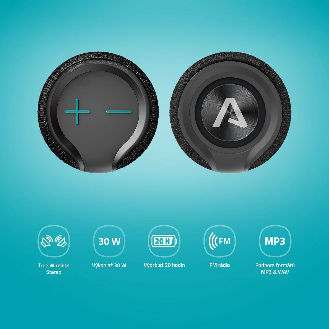 Naskoč na vlnu zábavy, s LAMAX LightNote1 to bude parádní jízda. V malém kompaktním těle přenosnýho repráku se ukrývá výkon až 30 W, který tě vydrží bavit až 20 hodin. Propoj s ním svoje zařízení přes Bluetooth 5.3 a užij si playlist, filmy nebo podcasty na maximum. Čistý a vyrovnaný zvuk ještě umocníš připojením dalšího repráku, což zařídí TWS funkce. Máš soubory na microSD nebo jiným zařízení? Pohoda, reprák podporuje řadu připojení i formátů. A když nemáš po ruce playlist, přecvakni na FM rádio a mejdan může začít. Atmošku dotvoří LED podsvícení. Ovládání tohohle mazlíka je snadný a intuitivní. Když hlásí, že mu dochází dech, energii mu doplníš přes USB-C a zase s tebou půjde, kam chceš. Klidně vyrazte ven, krytí IPX6 si poradí i s vrtochy počasí.