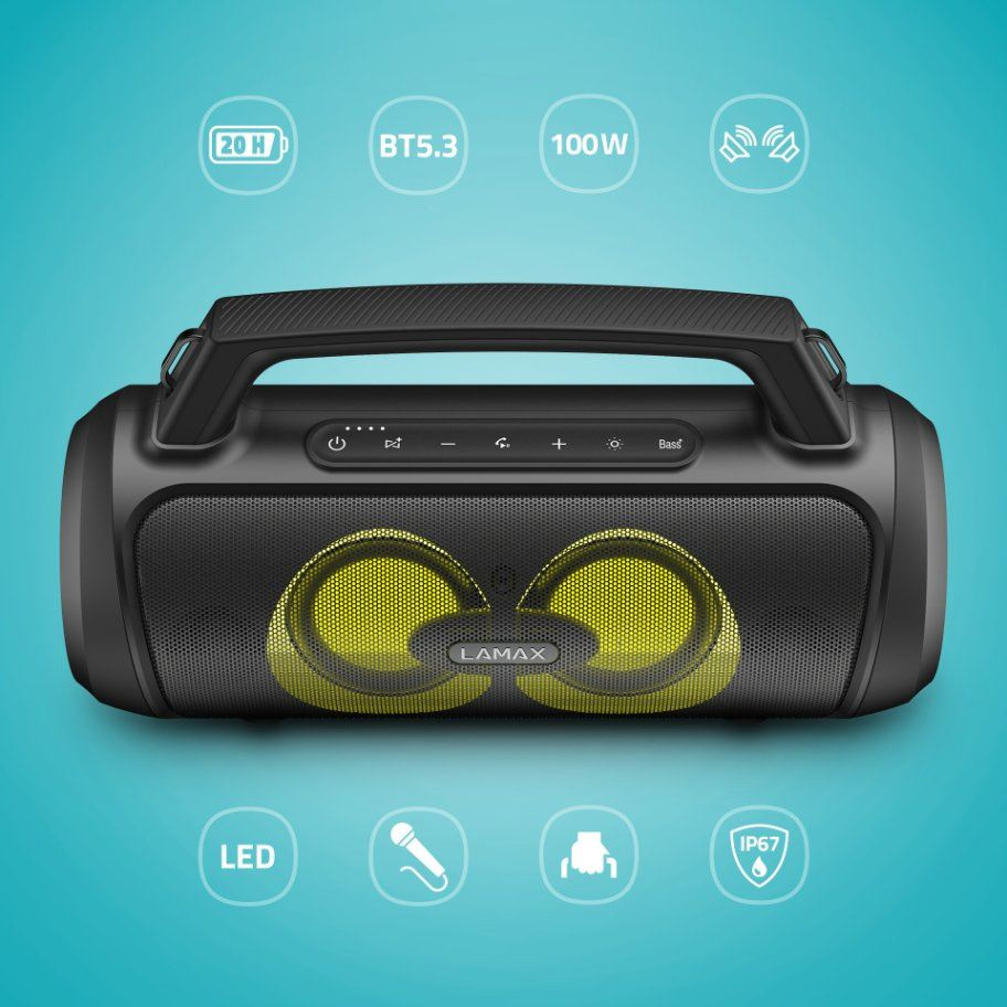 LAMAX PartyGo1 se nezdá, ale ukrývá v sobě výkon o velikosti 100 W, co rozehraje každou party na maximum. Pokud ti to nestačí, využij funkci TWS a připoj další PartyGo1 a výkon si zdvojnásob!