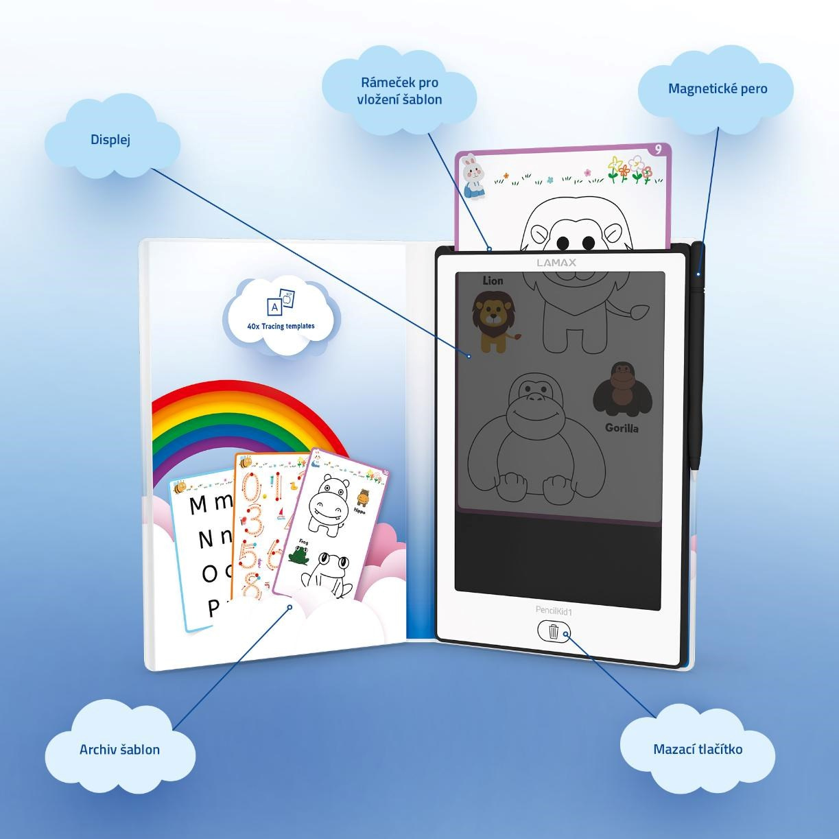 Ať už si děti chtějí kreslit zvířátka, trénovat první písmena nebo jen tak čmárat, co je právě napadne, LAMAX PencilKid1 jim poskytne prostor pro nekonečné tvoření. Kreslicí tabulka s 40 zábavnými obkreslovacími šablonami pomáhá rozvíjet kreativitu, jemnou motoriku i základy angličtiny. Předlohy je zábavným způsobem seznámí s písmeny, čísly, zvířaty, dopravními prostředky nebo třeba ovocem, a díky anglickým popiskům se děti přirozeně dostávají i k prvním cizojazyčným slovíčkům. Tabulka ale není určena jen pro nejmenší. Snadno si ji oblíbí i starší děti, které si do ní mohou zapisovat nápady nebo domácí úkoly do školy. Velká plocha nabízí dostatek místa pro psaní i kreslení a je zároveň šetrná k očím, protože nebliká a nevydává modré světlo. Po každém použití stačí jediné stisknutí tlačítka a plocha je připravena na nové nápady. Díky praktickému obalu ve tvaru knížky zůstane tabulka i se šablonami pěkně pohromadě a děti si ji mohou vzít kamkoliv – do školy, na výlet, k babičce nebo do čekárny u lékaře. A co je nejlepší? Není potřeba žádný papír, pastelky ani fixy. Jen jeden lehký pomocník, který podporuje tvoření, učení i zábavu ve chvílích, kdy potřebujete mít trochu klid.