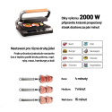 Kontaktní gril s příkonem 2000 W, grilovací plocha 1500 cm2, vyjímatelné plotýnky, vhodné do myčky, počet grilovacích ploch 2, odkapávací nádoba, regulace teploty, tepelná pojistka, nepřilnavý povrch, časovač, signalizace provozu, displej a zámek rukojeti, průvodce nastavením času a teplot.Více