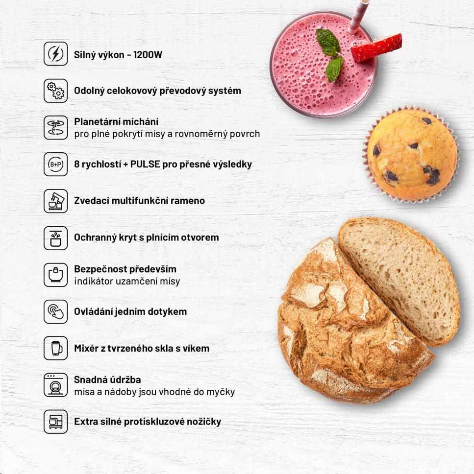 Váš kuchyňský superhrdinaLauben Kitchen Machine 1200BC je kuchyňský robot s bohatým příslušenstvím, díky kterému se za vás hravě postará o spoustu kuchyňských prací a zároveň vám ušetří místo v kuchyni. Ostudu vám v kuchyni neudělá ani vzhledem, což dokládá prestižní designové ocenění IF Design Award 2019. Míchání, šlehání, hnětení těsta i mletí masa, o to vše se spolehlivě postará spolehlivý měděný motor o výkonu 1200W a vysokozátěžové celokovové převody. Robot disponuje technologií EffectiMix® , která zajišťuje planetární mixovací pohyb a rovnoměrný výsledek. Díky systému SpeedPrecision® máte na výběr z 8 přesně kalibrovaných rychlostí a možnosti PULSE pro přesné výsledky. Hlavní mixovací nádoba je vyrobena z nerezové oceli a má kapacitu 5l. Robot jsme doplnili o mixovací sklenici z tvrzeného skla s víkem pro přidávání ingrediencí. Můžete ho tak využít k přípravě studených či vlažných polévek nebo čerstvých smoothies. Bezpečnost je vždy na prvním místě, proto je Lauben Kitchen Machine opatřen pojistkou, která ho spustí jen, je-li správně uzavřen, protiskluzovými nožkami a pojistkou proti přehřátí. Správné usazení mísy bude hračka díky barevnému indikátoru. Robot vás potěší i snadným ovládáním pomocí jediného tlačítka, nízkou hlučností a dvěma barevnými provedeními. Protože moc dobře víme, že není jednoduché každý den vymýšlet, čím nakrmíte rodinu či sebe, přidali jsme do balení kuchařku s recepty pro inspiraci.