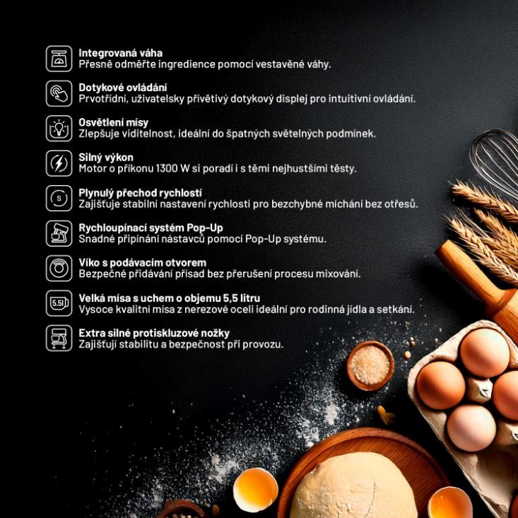 Kuchyňský robot vyniká výkonem 1 300 W, díky čemuž si poradí s hnětením i nejtužších těst.