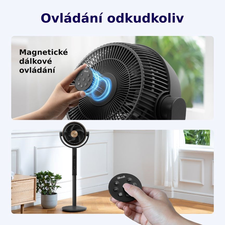 Stojanový ventilátor Levoit je vybaven praktickým magnetickým dálkovým ovládáním, které se snadno připojuje do středu ventilátoru, takže je vždy na očích. Tento chytrý design zajišťuje, že ovladač už nikdy neztratíte, a můžete ho mít po ruce, kdykoli ho potřebujete. Ovládání funguje na dostatečnou vzdálenost, takže nastavení můžete upravit klidně přes celou místnost, aniž byste museli vstávat z pohodlí svého křesla nebo postele.