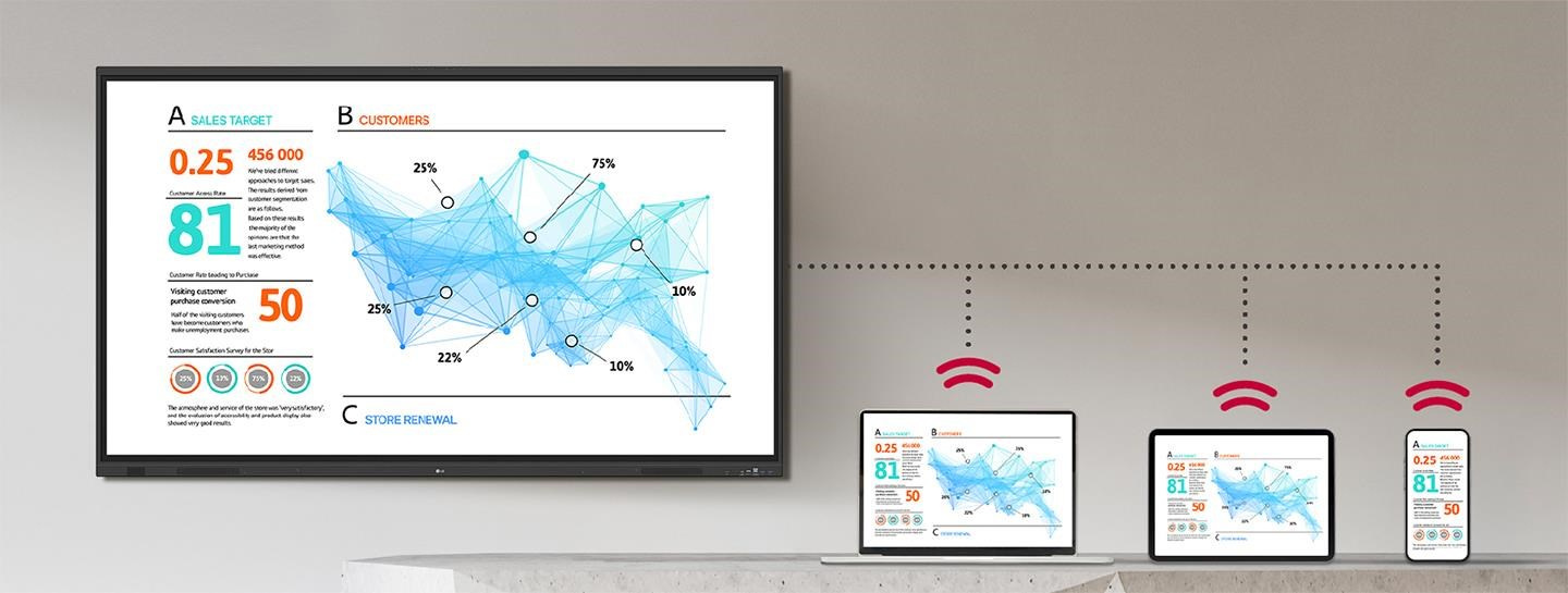 LG CreateBoard Share nabízí funkci bezdrátového sdílení obrazovky, která uživatelům poskytuje flexibilní prostředí pro diskusi. Svou obrazovku mohou sdílet ze svého PC, tabletu nebo chytrého telefonu, což výrazně zjednodušuje proces sdílení a spolupráce na týmových projektech či prezentacích.