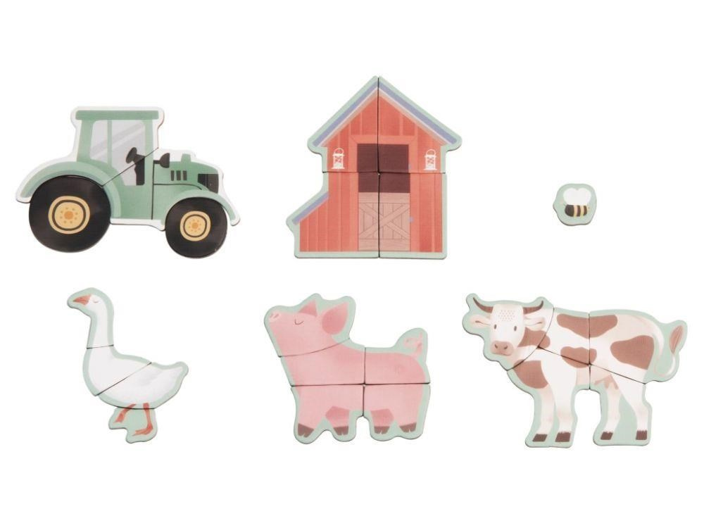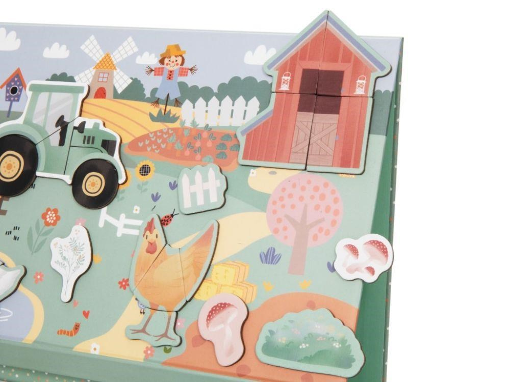 Magnetická hra 2v1 zavede děti na farmu se zvířátky, která mohou potkat ve svém okolí, v jejich reálné (skutečné) podobě. Na magnetickém obrázku s venkovskou krajinou si děti vytvoří vlastní farmu nebo si jen pohrají s jednoduchým puzzle. Z jednotlivých dílků puzzle děti poskládají traktor, zvířátka nebo dle přiložených kartiček celé obrázky..