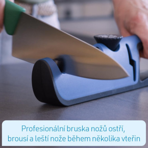 Multifunkční bruska na nože 18 W, 2 stupně broušení – hrubé a jemné, broušení většiny čepelí, nůžek a šroubováků, 3 brusné kameny, vodící lišty vedou nůž pod optimálním 15° úhlem, vyměnitelné brusné kameny, tichý chod bez vibrací, zásobník na prach, protiskluzové přísavky na stůl, ergonomické provedení.
