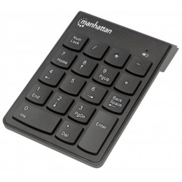 Manhattan Numeric Wireless Keypad enhances any notebook computing experience, especially when inputting important numeric data. The full-size 18-key layout and membrane (full-travel) key-switch technology reduce typing noise, improve response and provide low-profile keystrokes for fast and accurate data entry. A handy backspace key allows swift corrections. The asynchronous number-lock function allows users to simultaneously input letters from the computer's keyboard and numeric data from the keypad. Its USB Wireless Receiver connection, plug-and-play installation and ultra slim, lightweight construction make it easy to pack and travel.