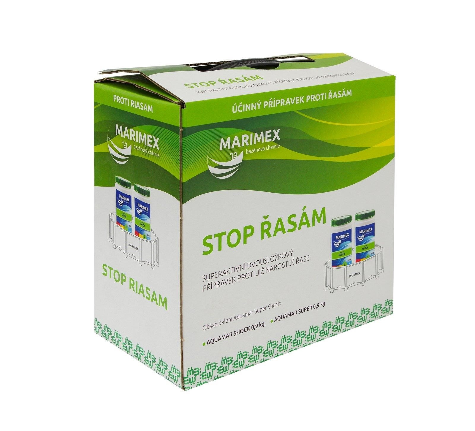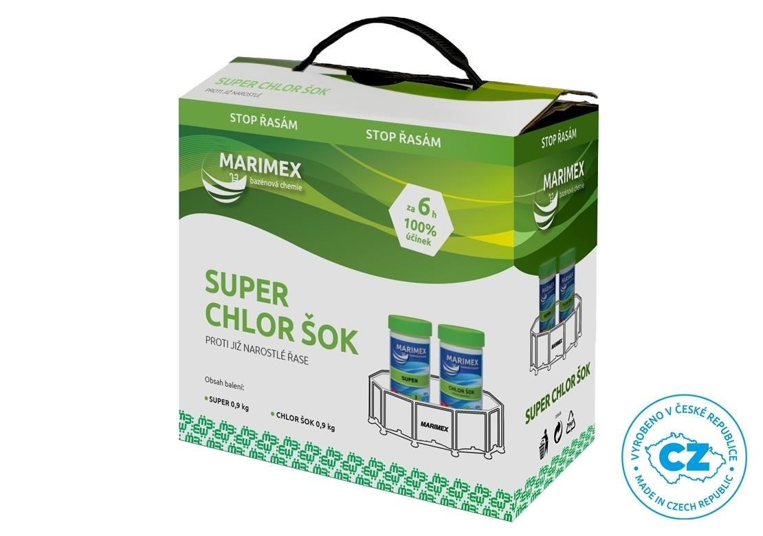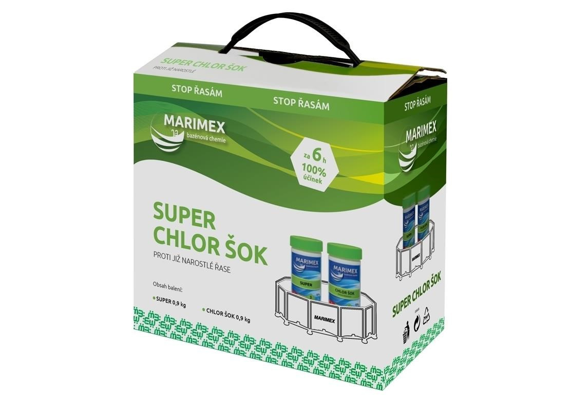 Marimex Super Chlor Šok je superaktivní dvousložkový prostředek proti již narostlé řase. Tento přípravek odstraní i černou řasu. Bublinky stoupající k hladině strhávají a nabalují řasy na sebe a vynášejí je s sebou na hladinu. Zneškodněné řasy z hladiny odstraní skimmer.