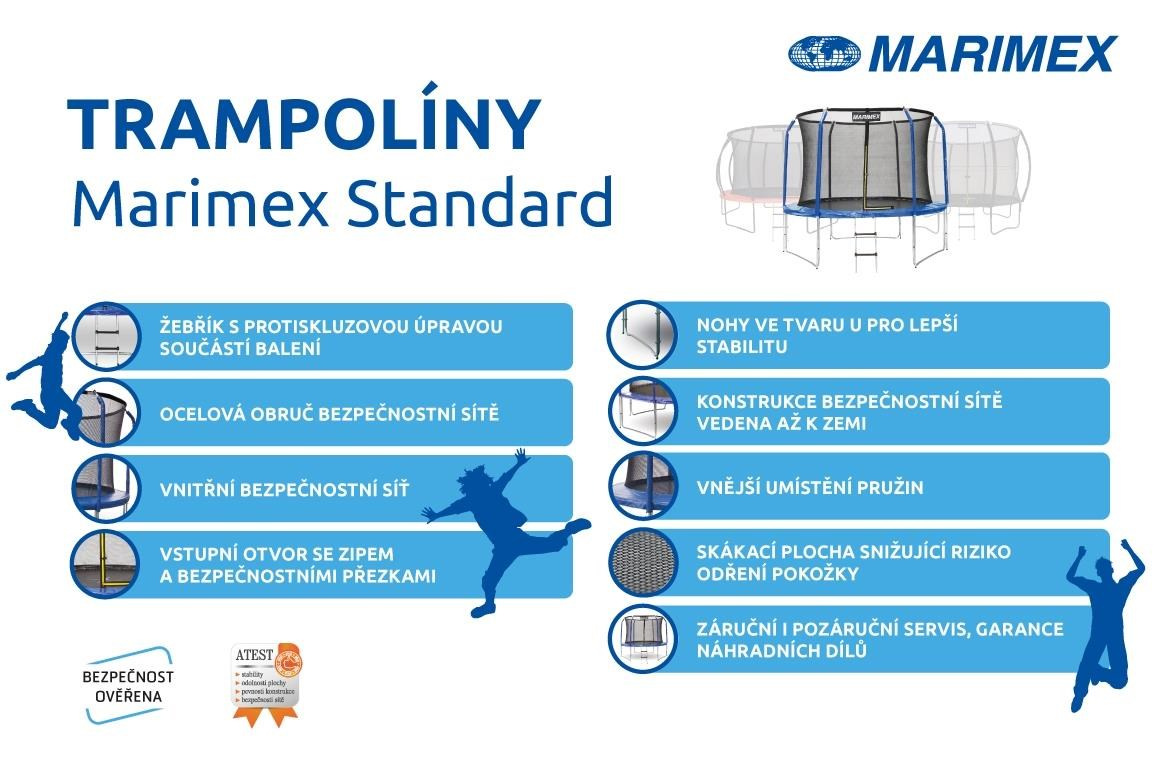 Trampolína Marimex Standard je skvělým doplňkem každé zahrady. Děti skákání na trampolíně milují a při skákání si snadno zacvičí i dospělí - nosnost je až 50 kg. Dokonalou stabilitu zajišťují tři nohy ve tvaru písmene U.