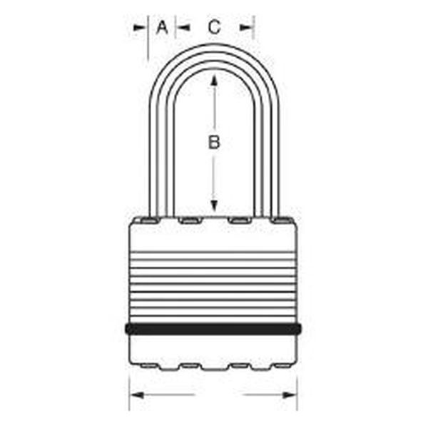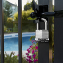 - Visací zámek o šířce 64 mm s tělem z vrstvené oceli zpevněný titanem pro vyšší odolnost a spolehlivost.