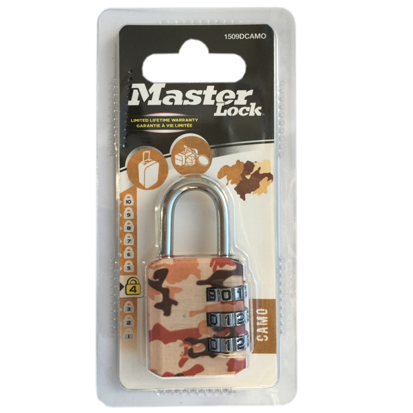 Visací kombinační zámek 1509EURDCAMO pro všeobecnou ochranu. Zinkové tělo zámku je o šířce 30mm. Ocelový třmen o průměru 5mm je dlouhý 22mm a je vyroben z pochromované oceli a nabízí odolnost proti řezání a řezání. Vlastní nastavení 3-místné kombinace zámku nabízí pohodlí bez klíče.