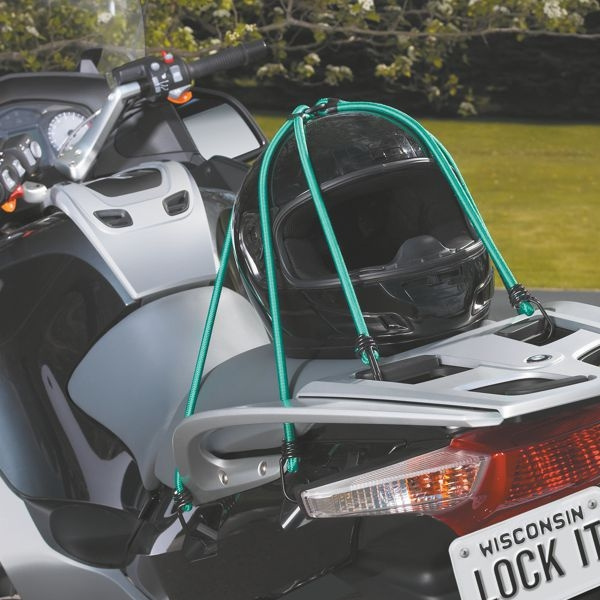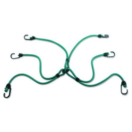 Set 3ks vzájemně propojených upínacích gum zakončených háčky, tzv. „pavouk“. Délka gumy 800 mm a Ø8 mm. Maximální nosnost 40 kg. Háčky z dvojitého drátu pro větší pevnost v tahu. Zaoblené konce háčků zabraňující poškrábání. Barva: zelená Cena za set