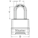 - Visací zámek o šířce 56 mm s tělem ze zinkového odlitku s mosaznou úpravou vysoce odolnou proti korozi.
