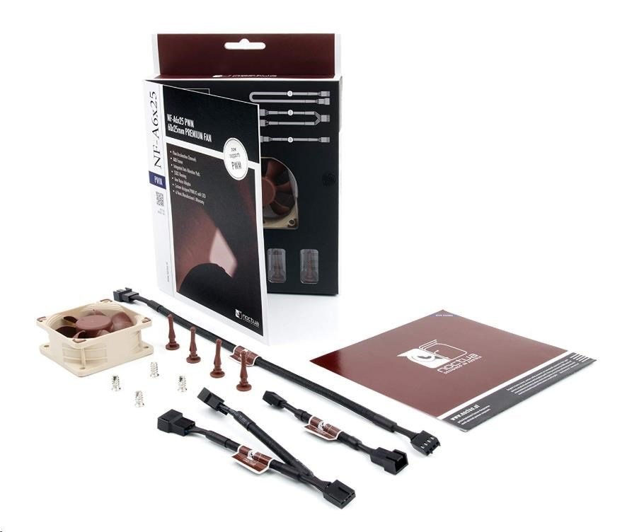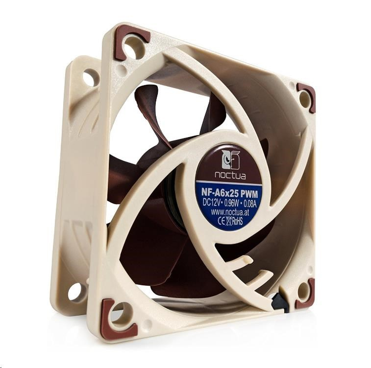 ventilátor, tichý, rozměry 60x60x25mm, hlučnost 13.7 až 19.3dB, průtok 22.6 až 29.2 m3/h, 550 až 3000 otáček, L.N.A., optimalizovaná geometrie a povrch 7 lopatek, samostabilizující olejové ložisko SSO2