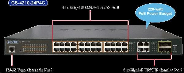 Popis Planet GS-4210-24PL4C PoE+ switch 28x 1000Base-T, 4x SFP, 802.3at do 440W, VLAN, SNMPv3/WEB