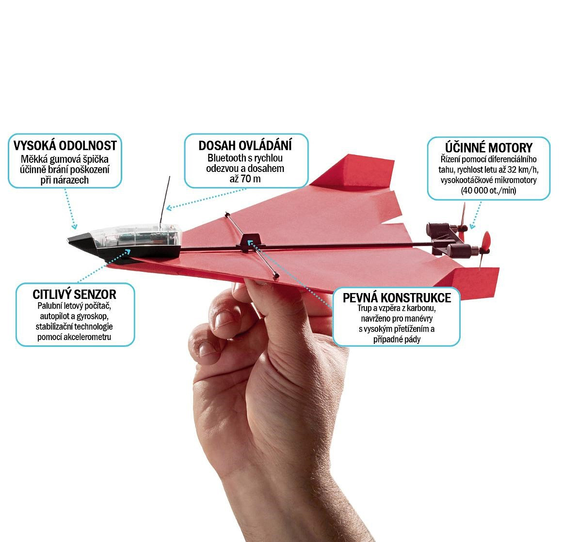 Obejdete se bez technických znalostí nebo zdlouhavého studování manuálů. Základní model podle přiložených šablon složíte stejně snadno a rychle, jako byste skládali klasickou vlaštovku. Následně stačí připevnit modul s motorem a vyrovnávací tyč, vše zajistit lepící páskou (kdyby jste náhodou bourali), spárovat s telefonem a můžete startovat.