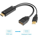 PremiumCord adaptér HDMI to DisplayPort Male/Female s napájením z USB - Vstupní konektor: HDMI /Male - Výstupní konektory: DisplayPort /Female - Převádí signál HDMI na DisplayPort signál - Na vstupuHDMI 1.4 přijímač – Link rate up to 2.97 Gbps/data pair. – Hloubka barev až 16 bits na barvu – 3D video timings - Výstup kompatibilní s DP 1.2 – Video rozlišení až 4Kx2K @ 30 Hz; 1920 x 1080 @ 120 Hz. – Audio 7.1 až do 192 kHz sample rate. - Malá spotřeba, aktivní 500 mW & standby 25 mW - Napájení pomocí USB konektoru - Barva : černá.