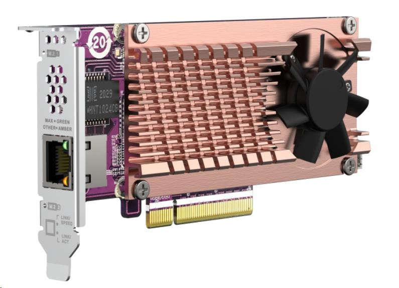 Zařízení QM2-2P10G1TB umožňuje snadno přidat k vašemu QNAP NAS dva M.2 NVMe SSD a připojení 10GbE RJ45. Ve srovnání s rozhraním SATA rozhraní PCIe Gen3 x 8 zařízení QM2-2P10G1TB nabízí vyšší přenosovou šířku s větším výpočetním výkonem a rychlejším přístupem k datům. Zařízení QM2-2P10G1TB zvyšuje výkon NAS přidáním M.2 PCIe Gen3 NVMe SSD. Nezabírá 3,5" pozice pro disky, což umožňuje maximalizovat úložnou kapacitu i výkon. Zařízení QM2-2P10G1TB disponuje síťovým portem 10GBASE-T Multi-Gigabit (10G / 5G / 2,5G / 1G / 100M), díky němuž vaše zařízení QNAP NAS může získat vysokorychlostní konektivitu 10GbE pro úkoly náročné z hlediska přenosové šířky. S různými switchi QNAP 10GbE můžete snadno provést upgrade na vysokorychlostní síťové prostředí.