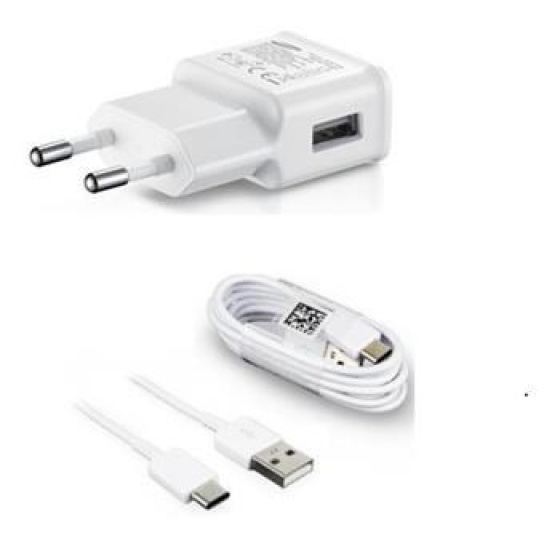 Samsung cestovní nabíječka do sítě s USB výstupem a maximálním výkonem 15W a USB-C nabíjecím kabelem.