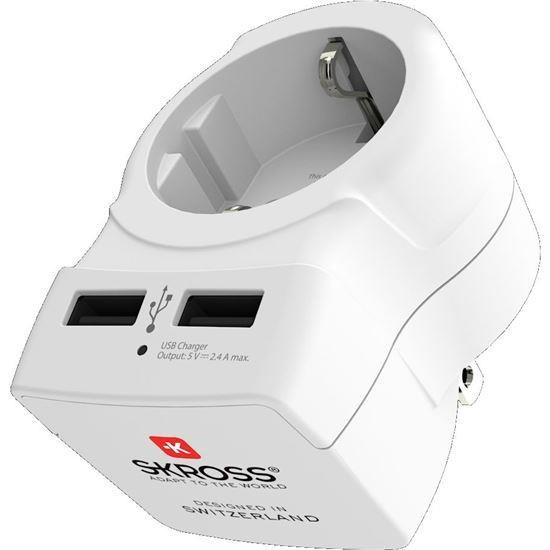 cestovní adaptér s uzemněním, max. 15A integrovaný USB nabíjecí adaptér 2400mA výhodné spojení dvou zařízení v jednom pro obyvatele Evropy, navštěvující USA a země s USA standardem Schuko uzemnění zásuvky, pro všechny spotřebiče s 2- a 3-kolíkovou šňůrou dětské pojistky švýcarská kvalita a design barva: bílá.