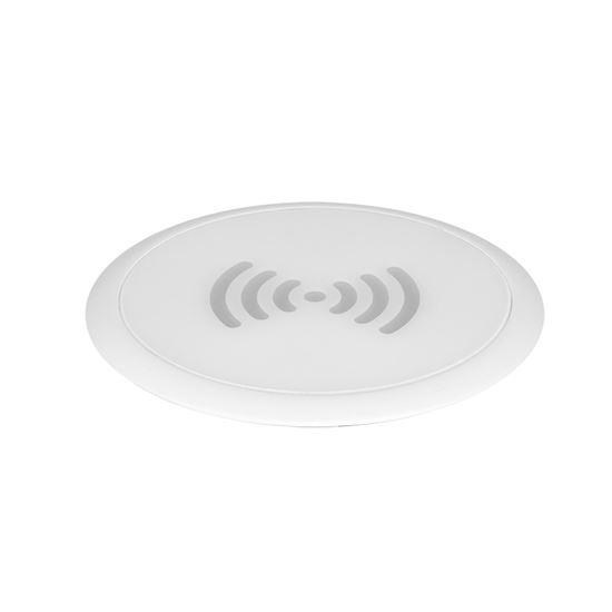 Vestavná bezdrátová nabíjecí podložka, Wireless Qi 15W, AC/DC adaptér DC 12.0V / 2.0A, 24W, přívodní kabel 1.5m, průměr otvoru v desce stolu: 60mm, nabíjecí výkony 15W – 10W – 7.5W – 5W, barva vrchního krytu: bílá.