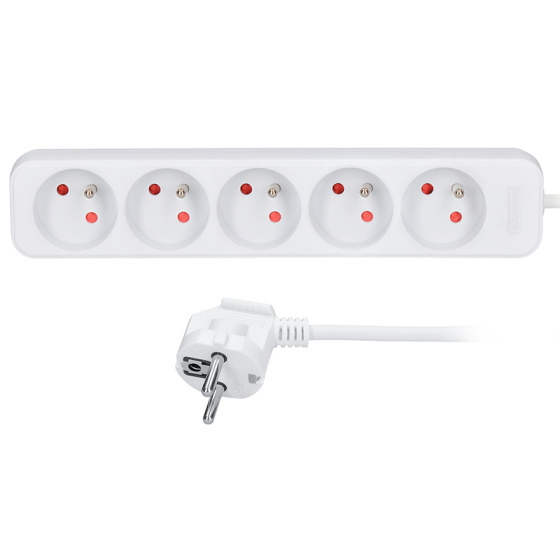 Počet zásuvek: 5, průřez vodičů: 3 x 1mm2, typ kabelu: H05VV-F3, lomená vidlice, barva: bílá.